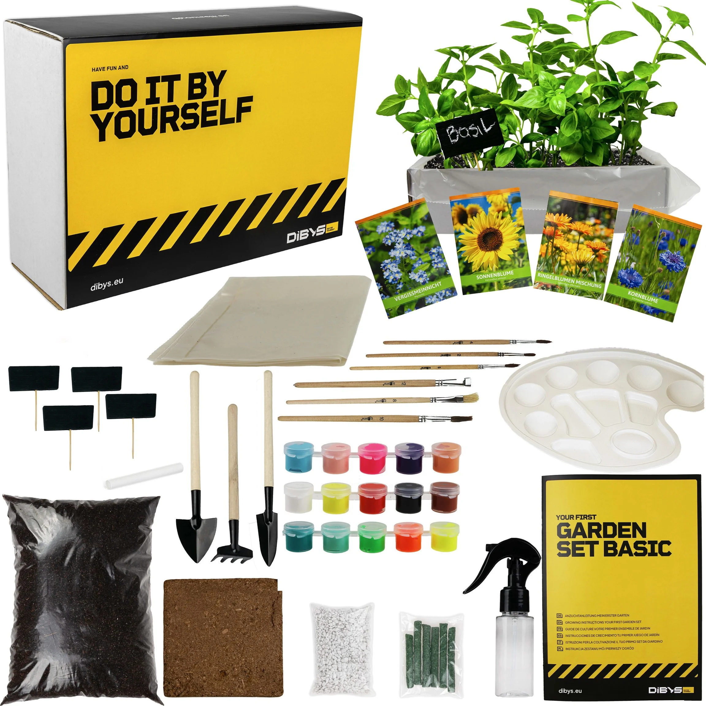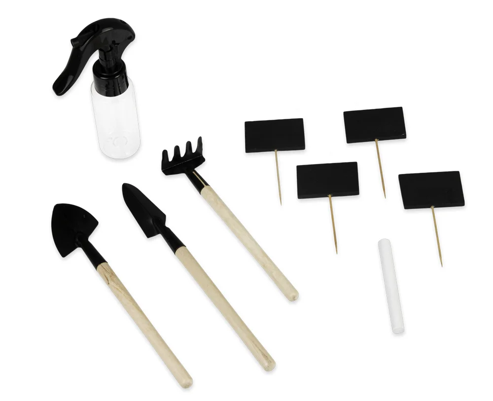 Akcesoria: 4 tabliczki oraz kreda do oznaczania roślin, 3 mini narzędzia ogrodowe (łopatka, szpadel, grabki), spryskiwacz do podlewania – wszystko, czego potrzebujesz do skutecznej pielęgnacji roślin.