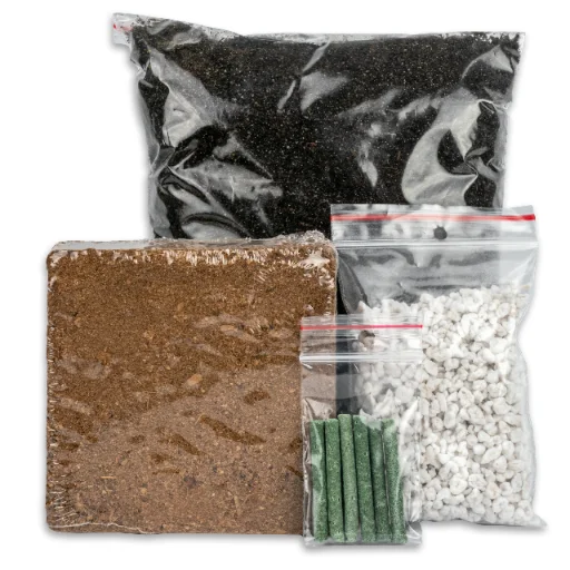 Podłoże: torf kokosowy (140 g), ziemia (350 g), perlit (10 g), podkład foliowy oraz 6 pałeczek nawozowych – zapewnią roślinom optymalne warunki do wzrostu.
