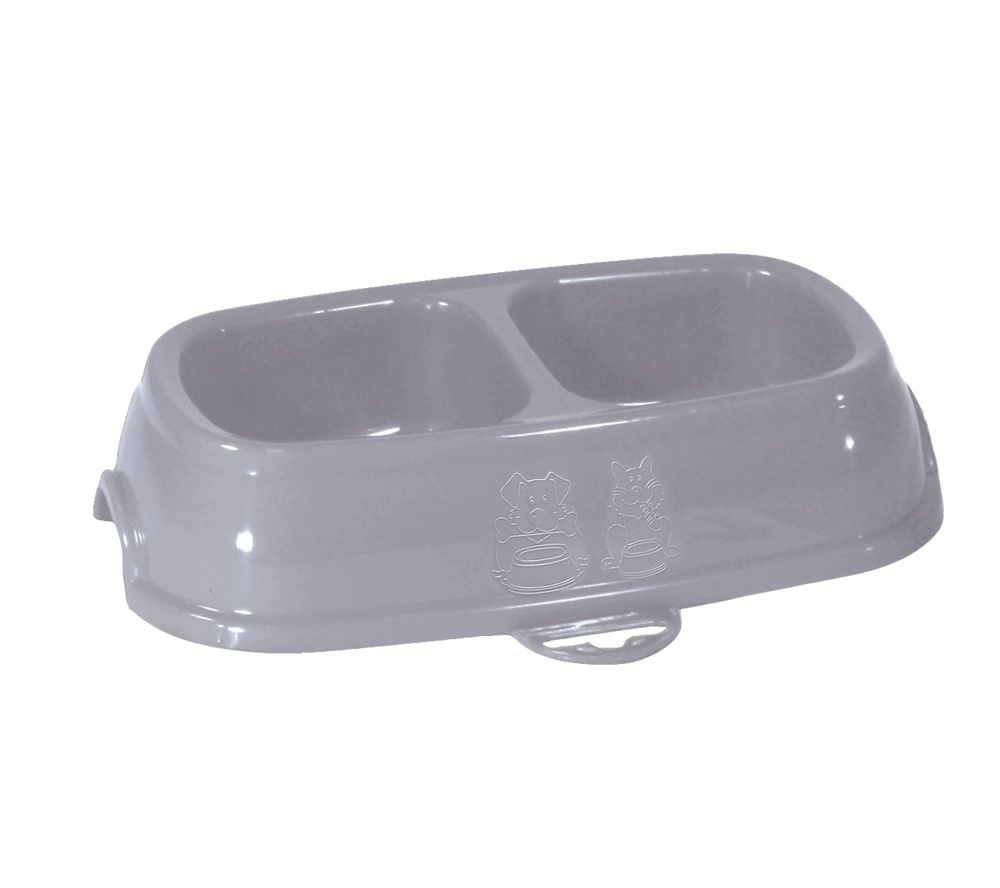 Podwójna lekka miska w modnym kolorze dla domowego pupila. Przeznaczona zarówno dla psów i kotów. Bardzo praktyczna, wykonana z wysokiej jakości plastiku. Łatwa do utrzymania w czystości. Zamocowane antypoślizgowe gumy zapobiegają ślizganiu się miski. Dwa asymetryczne pojemniki na karmę i wodę.