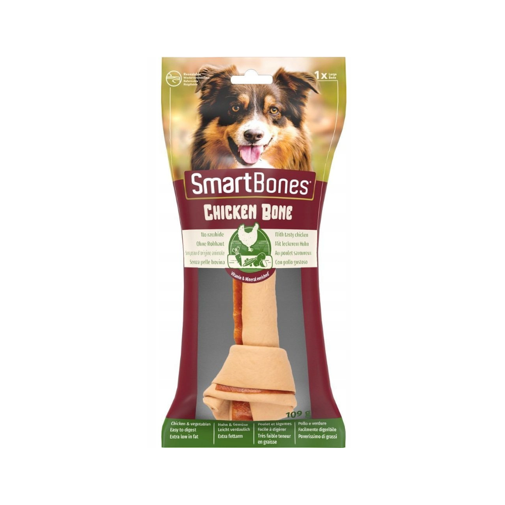SmartBones Chicken Bone to przepyszna kość do żucia bez skóry (no rawhide) ze smakowitym kurczakiem. Rozmiar Large jest odpowiedni dla psów dużych ras w każdym wieku. Kość jest wzbogacona w witaminy i minerały, a jej największym benefitem jest lekkostrawność i bardzo niska zawartość tłuszczu. Podczas żucia przysmaku naturalny proces ścierania czyści zęby i zapewnia ich zdrowy stan. SmartBones Chicken Bone – Large dla psów dużych ras to idealna przekąska między posiłkami. Psy wprost przepadają za smakowitym połączeniem mięsa z kurczaka i warzyw.